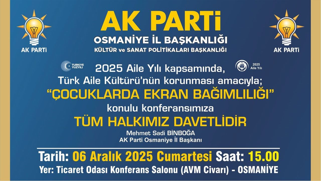 AK Parti Osmaniye İl Başkanlığı Kültür ve Sanat Politikaları Başkanlığı, 2025 Aile Yılı kapsamında çocukların dijital çağda karşı karşıya kaldığı en kritik sorunlardan biri olan ekran bağımlılığına dikkat çekecek kapsamlı bir konferans programı hazırladı. Çocukların zihinsel, duygusal ve sosyal gelişimlerini doğrudan etkileyen ekran kullanım alışkanlıklarının ele alınacağı etkinlikte, uzman psikologlardan oluşan ekip sahne alacak.