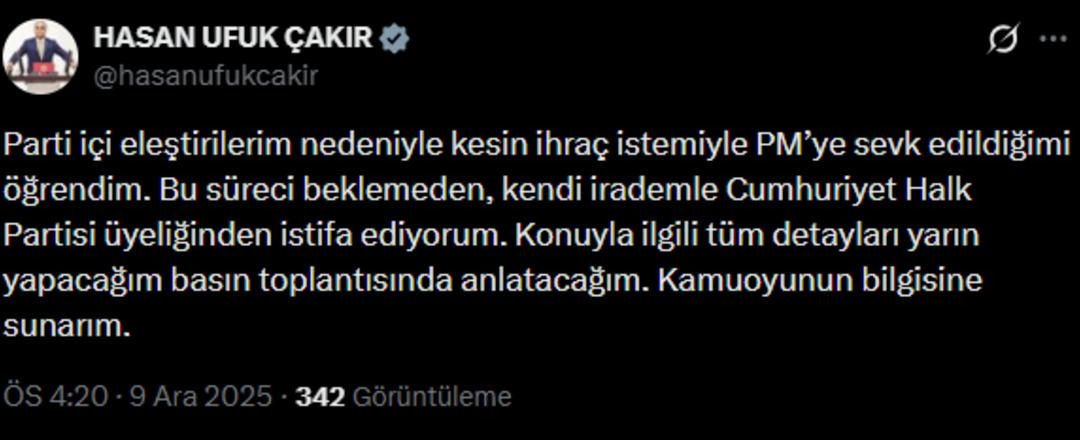 Disiplin sevkinin açıklanmasının ardından Hasan Ufuk Çakır, “Onlar beni ihraç edemez, ben CHP’den istifa ediyorum” ifadelerini kullandı. İstifa kararını yarın düzenleyeceği basın toplantısıyla detaylandıracağını belirten Çakır, partisinden ayrılma kararını sosyal medya hesabı üzerinden de kamuoyuna duyurdu.