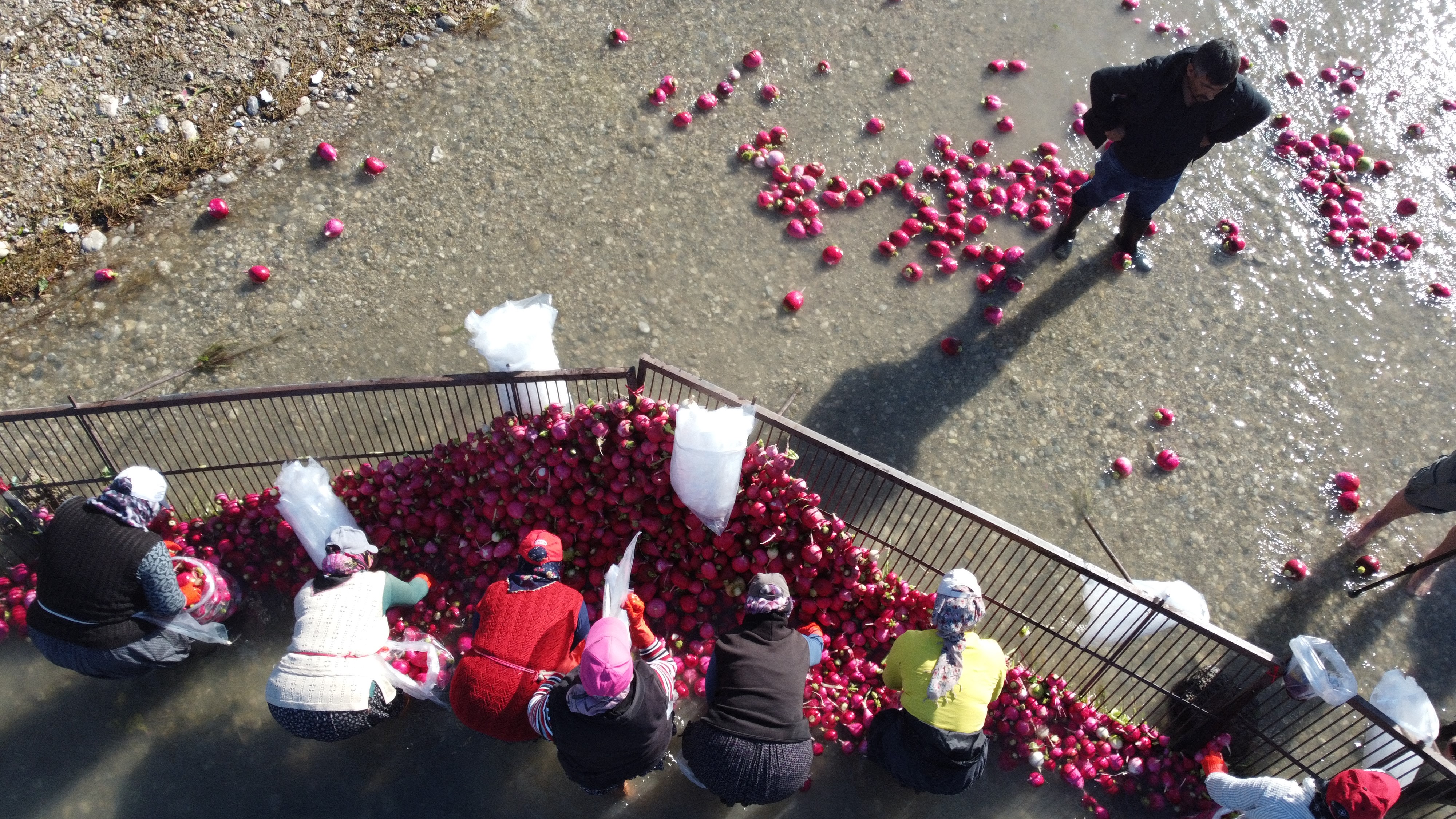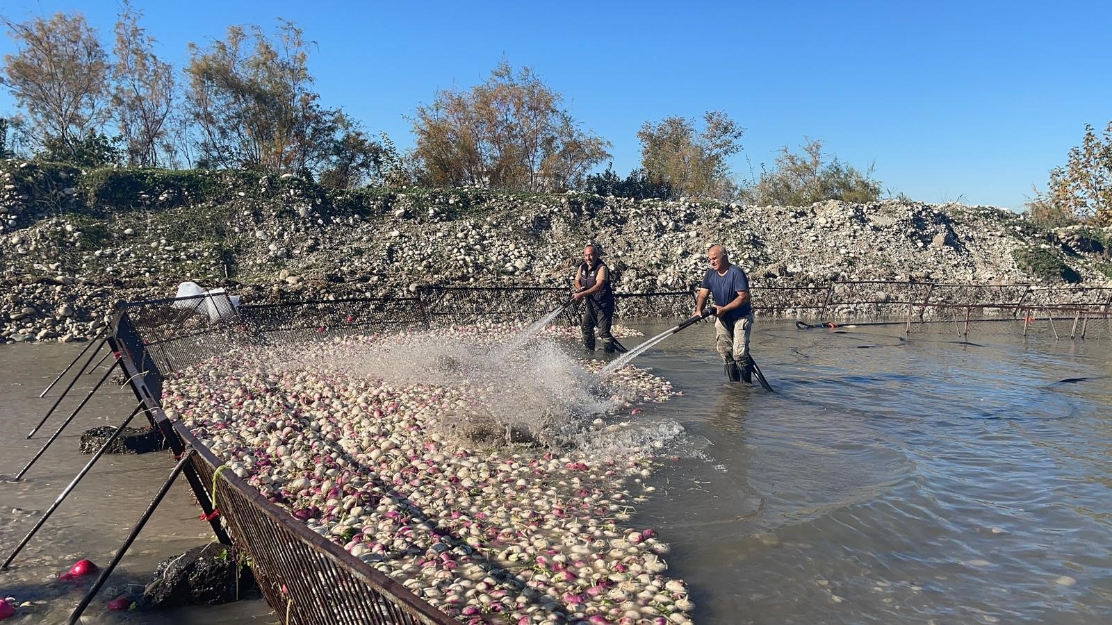 Kadirli’de turp işinde çalışan kadınlar, günün ilk saatlerinde işbaşı yapıyor. Sabah 07.30-08.00 saatleri arasında başlayan mesai, kamyonların dolmasına kadar devam ediyor. Tarladan traktör römorklarıyla getirilen turplar, önce boşaltılıyor ardından yıkama alanlarına alınıyor. Burada hortumlar ve Savrun Çayı’nın soğuk suları kullanılarak turplar tek tek temizleniyor.